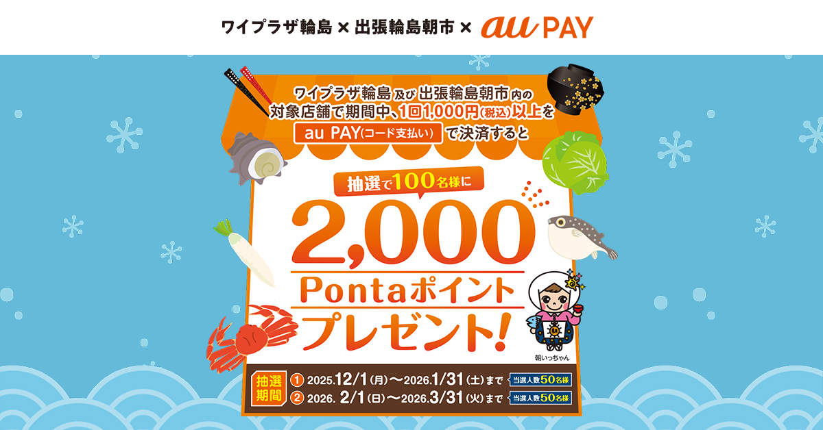 「ワイプラザ輪島」及び「出張輪島朝市内」の対象店舗で1回1,000円(税込)以上をau PAY(コード支払い)で決済すると、抽選で100名様に2,000Pontaポイントプレゼント!
