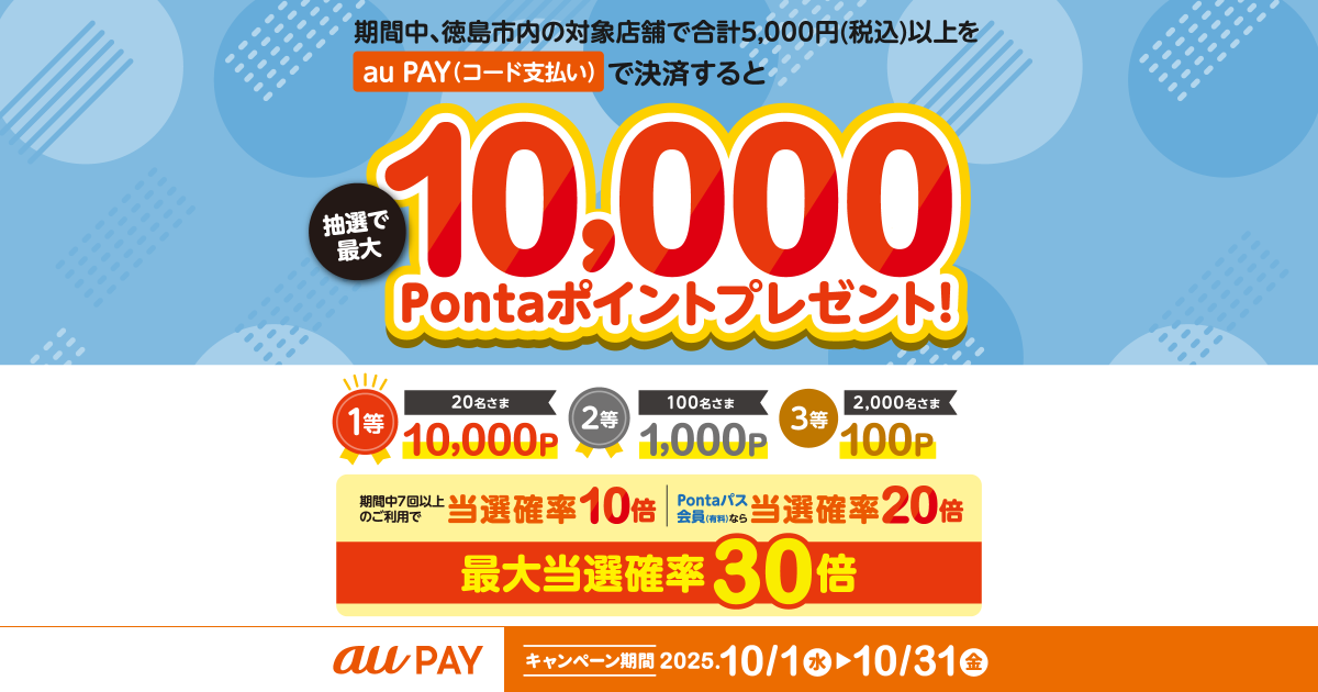 徳島市内の対象店舗で合計5,000円(税込)以上をau PAY(コード支払い)で決済すると、抽選で最大10,000Pontaポイントプレゼント!