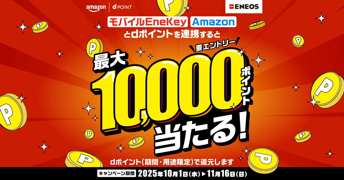 モバイルEneKey(ENEOS公式アプリ)とdポイントおよびAmazonアカウントとdアカウントを連携すると、抽選で下記のdポイント(期間・用途限定)が当たる
