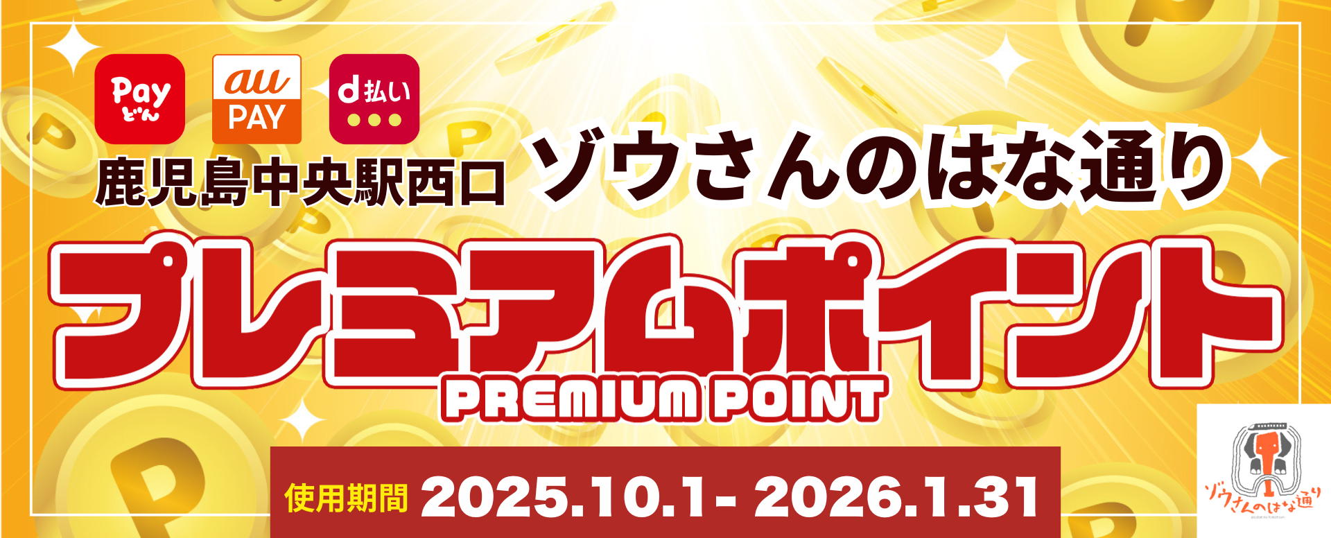 鹿児島市プレミアム付商品券発行支援事業ゾウさんのはな通りプレミアムポイント おかげさまで Payどん は10/13日完売となりました ゾウさんのはな通り プレミアムポイント概要 ■販売期間 2025年(令和7年)10月1日(水)