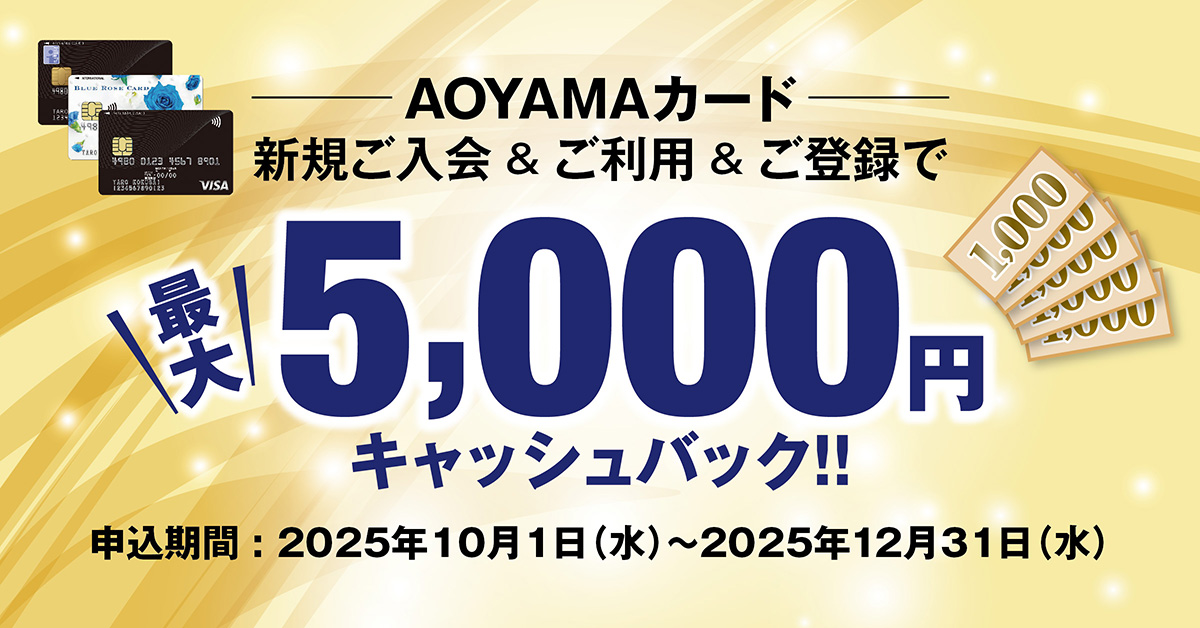 「新規ご入会&ご利用で最大5,000円キャッシュバック!AOYAMA VISAカード新規入会キャンペーン」に関する情報をご案内。クレジットカードなら安心と信頼の三井住友VISAカード。