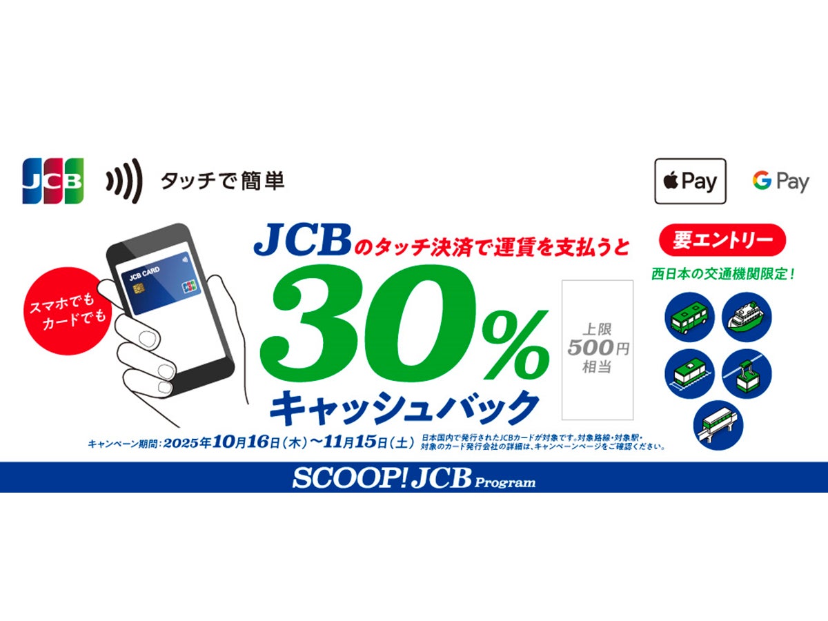 JCBのタッチ決済で対象の公共交通機関に乗車/乗船すると、対象利用合計金額の30%をキャッシュバック