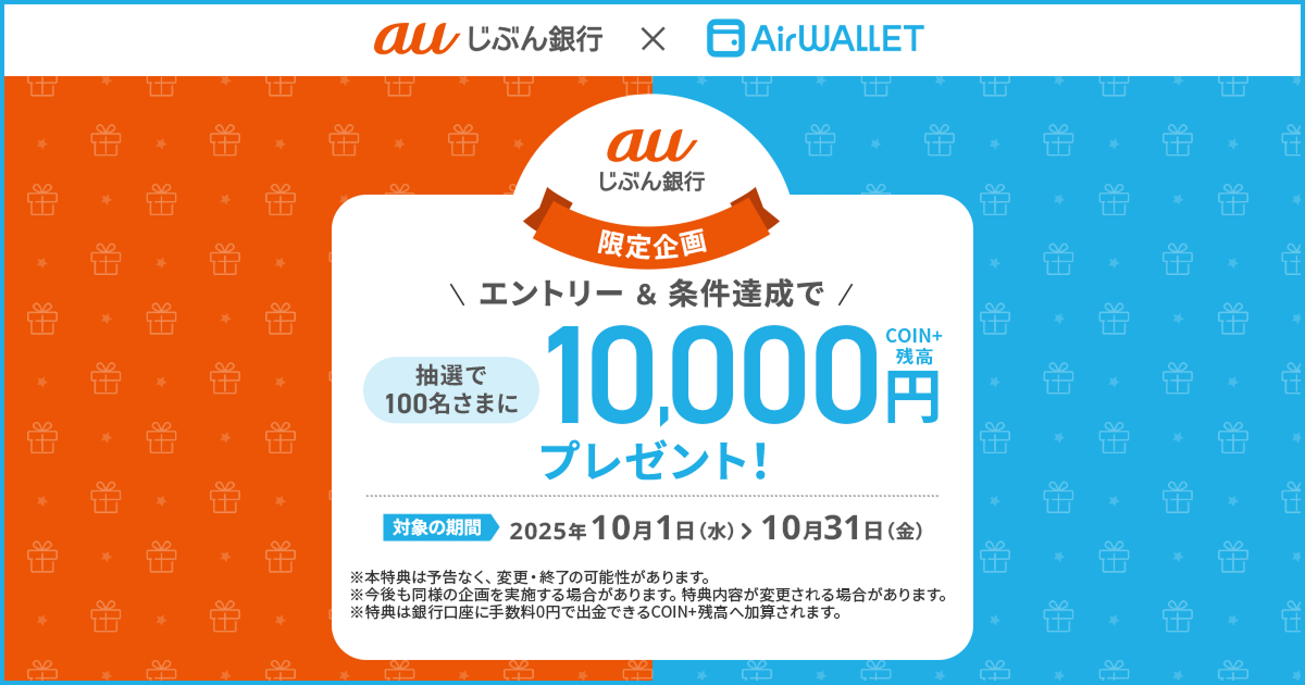期間中にauじぶん銀行の口座をエアウォレットに追加し、追加した口座に10,000円以上を出金すると、抽選で100名に10,000円分のCOIN+残高が当たる