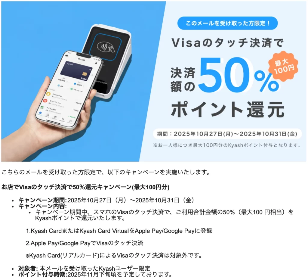 案内メールを受け取った会員が、Kyash CardまたはKyash Card Virtualを登録したApple Pay/Google PayのVisaのタッチ決済を利用すると、50%のKyashポイントを付与
