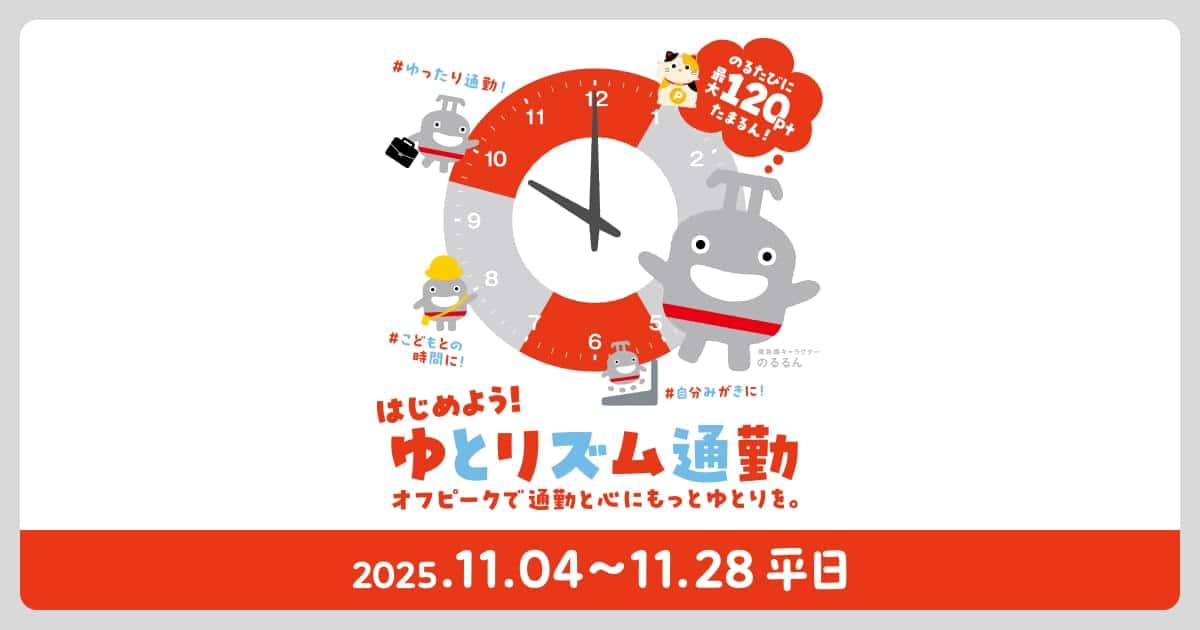 ピーク時間帯の前後にのると、1日最大120ポイントたまるキャンペーンを11月28日まで実施中!オフピーク通勤で心にゆとりを。詳細はこちらから!