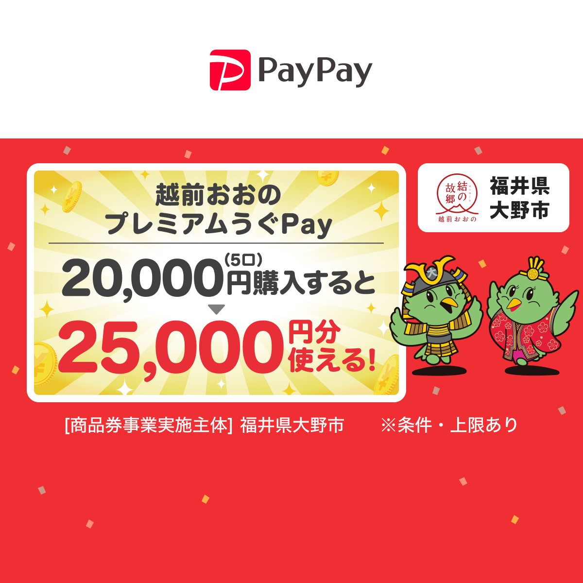 PayPayの本人確認が完了している12歳以上を対象に、福井県大野市内の対象店で利用できる2,500円分の越前おおのプレミアムうぐPay(PayPay商品券)をPayPayアプリにて2,000円で販売