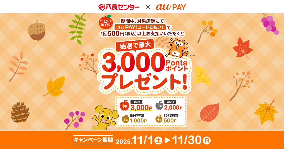 「八食センター内の対象店舗」で1回500円(税込)以上をau PAY(コード支払い)で決済すると、抽選で最大3,000Pontaポイントプレゼント!【キャンペーン期間:2025年11月1日(土)~11月30日(日)】