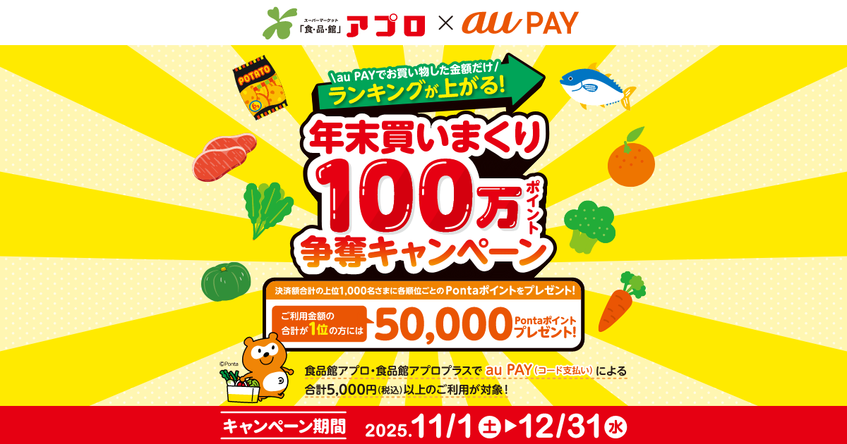 食品館アプロ・食品館アプロプラスでau PAY(コード支払い)による合計5,000円(税込)以上のご利用が対象!決済額合計の上位1,000名様にPontaポイントをプレゼント!1位には50,000Pontaポイント!