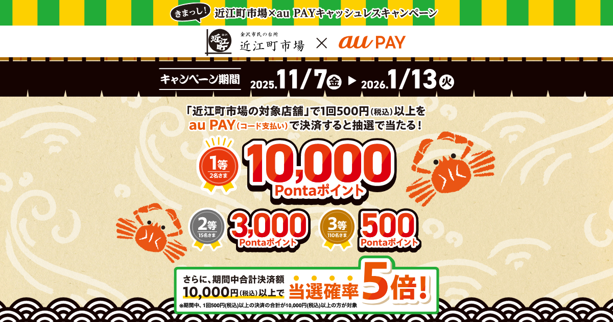 「近江町市場の対象店舗」で1回500円(税込)以上をau PAY(コード支払い)で決済すると、抽選で最大10,000Pontaポイントプレゼント!さらに、期間中、1回500円(税込)以上の決済額の合計が10,000円(税込)以上で当選確率5...