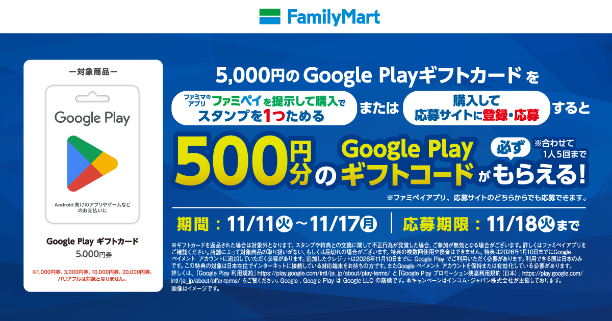 キャンペーン期間中に、ファミリーマート各店舗にて Google Play ギフトカード 5,000円券を購入し応募すると、もれなく500円分の Google Play ギフトコードがもらえる!