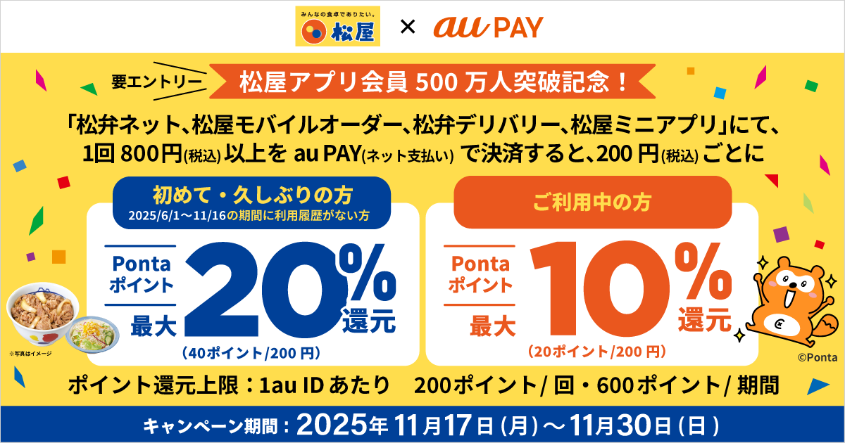 松弁ネット/松屋モバイルオーダー/松弁デリバリー/松屋ミニアプリにて、au PAY(ネット支払い)で1回800円以上を決済すると、通常の20倍となる200円につき20PのPontaポイントを付与
