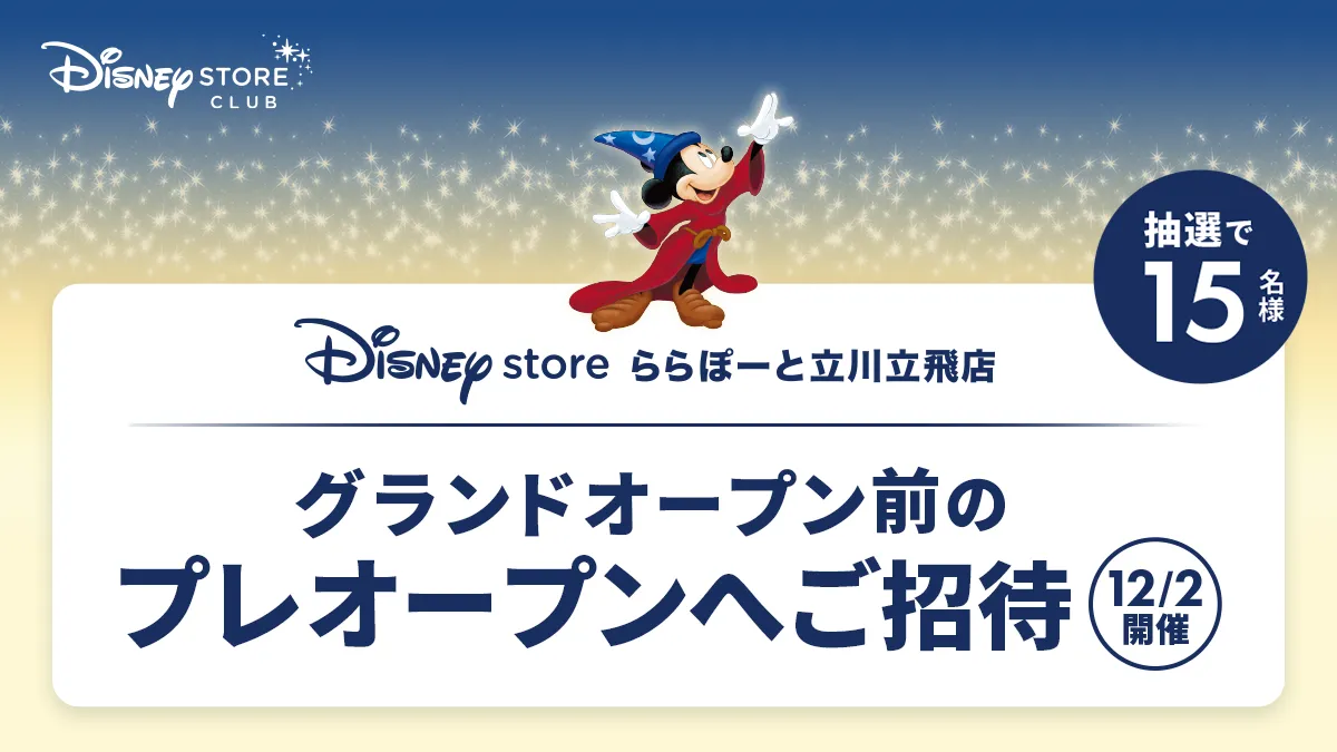 12月3日(水)ディズニーストア ららぽーと立川立飛店のグランドオープンに先だち、12月2日(火)のプレオープンへ抽選で15名様をご招待いたします。キャンペーン期間:2025年11月17日(月)10:00~11月24日(月)23:59