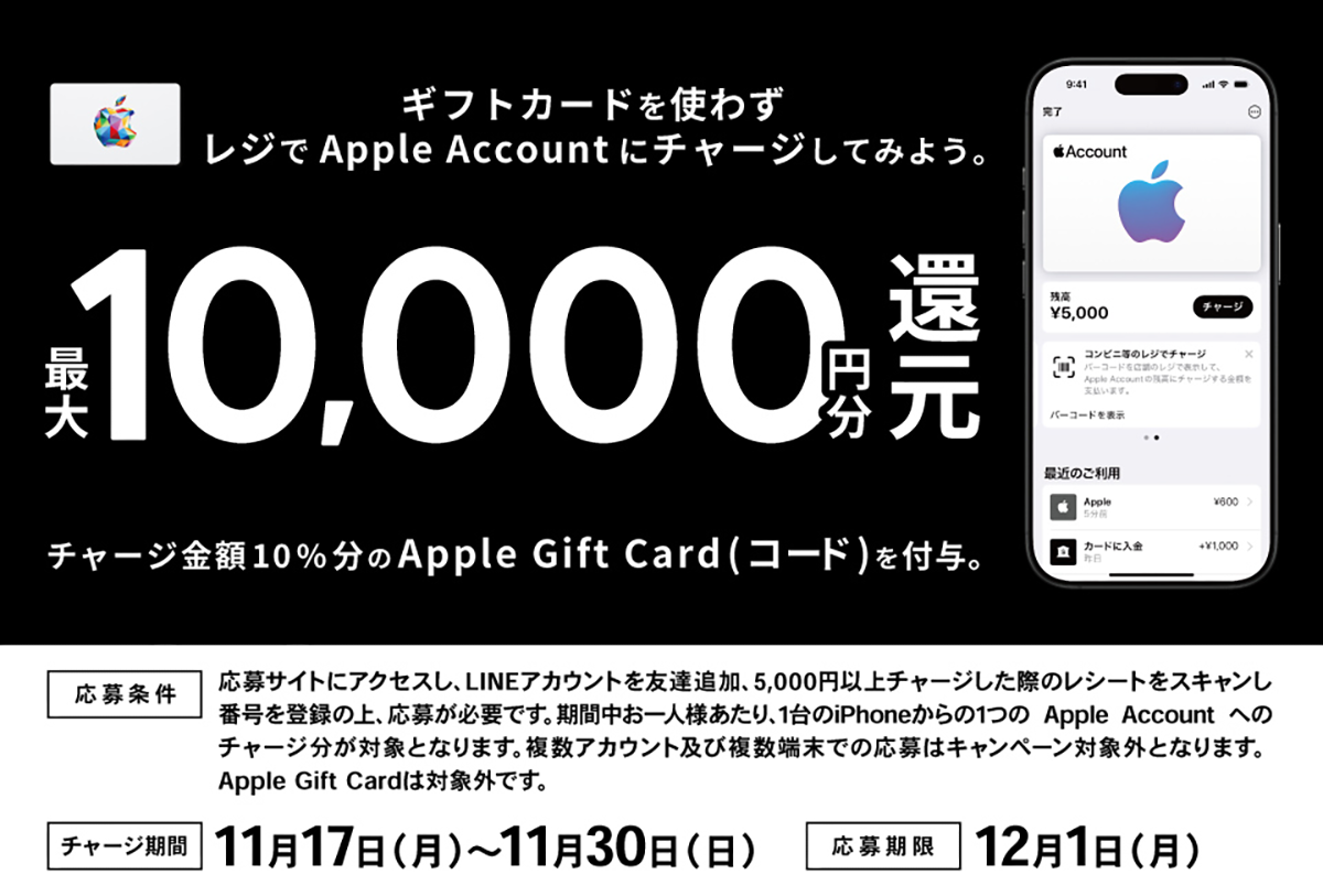 レジでApple Accountに累積5,000円以上チャージし、チャージ時のレシートをアップロードのうえ登録後、累積チャージ金額の最大10%分(最大10,000円分)のApple Gift Card(コード)をプレゼント!