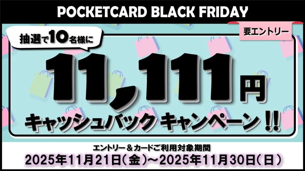 ▶ポケットカード、11月30日までに5万円以上利用すると抽選で11,111円キャッシュバックが当たるキャンペーン開催