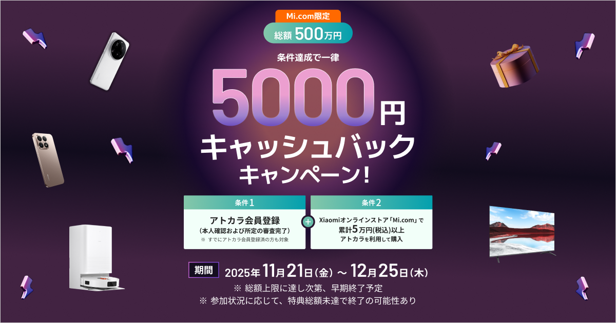 総額500万円!期間中に条件を達成すれば、一律5000円をキャッシュバック。アトカラを使って、お得にXiaomiの商品をゲットしよう。