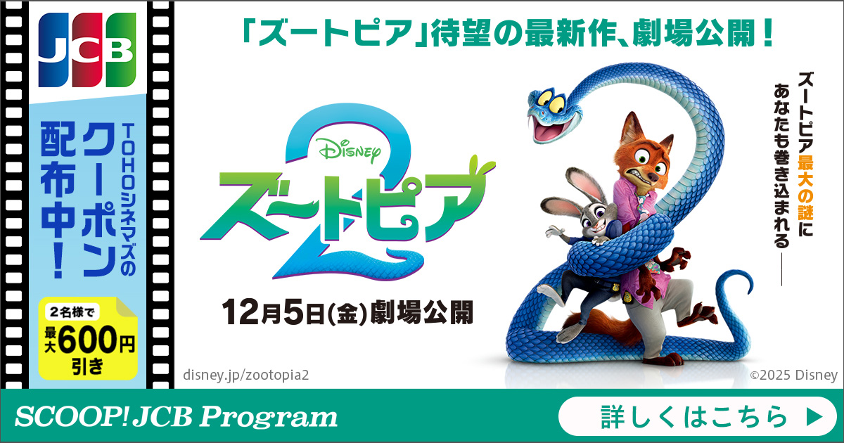 期間中、本ページからJCBカードをお持ちの方限定で、映画『ズートピア2』のTOHOシネマズで使えるクーポンを発行いただけます。