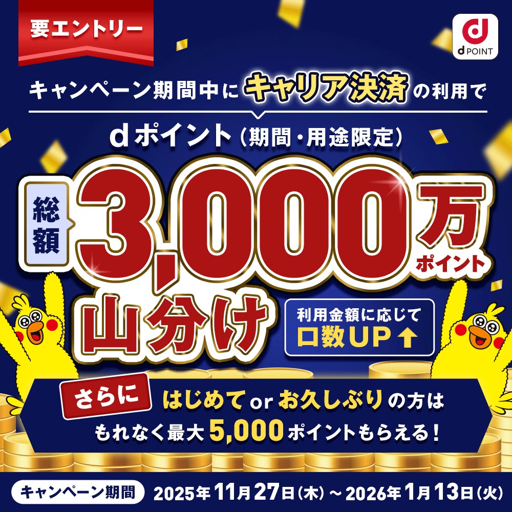 [2]2025年8月27日〜11月26日に利用のない会員が、キャンペーン期間中にApp StoreまたはGoogle Playアプリ内でドコモのキャリア決済を利用すると、合計利用額に応じて下記のdポイント(期間・用途限定)をもれなく付与