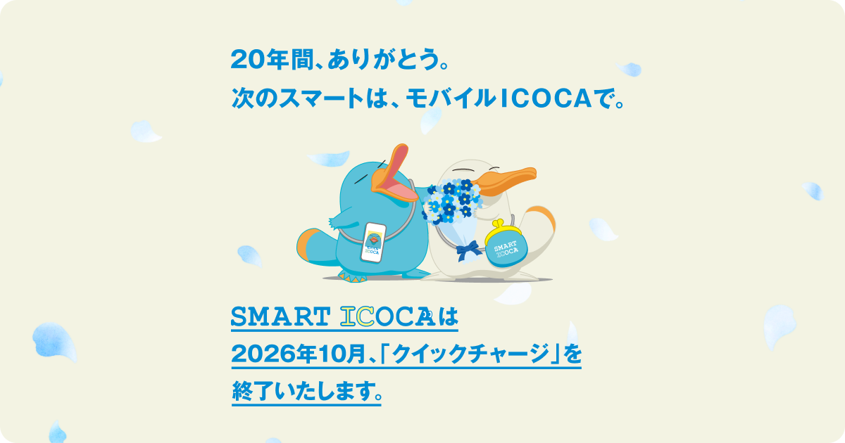 20周年を迎えるSMART ICOCAは、2026年10月、クイックチャージを終了します。サービスを使ってくれたすべての皆さまに感謝します。ほんとうに、ありがとうございました。ICOCAは、さらに進化しています。そのサービスは、モバイルIC...