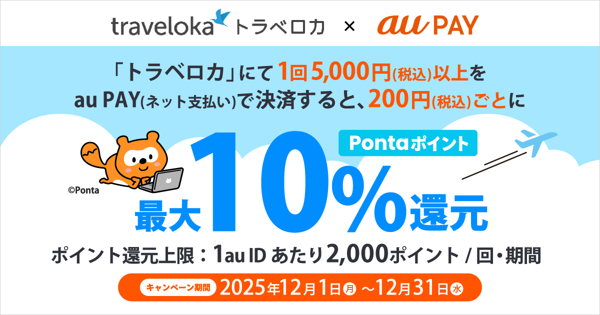 トラベロカにてau PAY(ネット支払い)で決済された方を対象に、Pontaポイント最大10%還元!キャンペーン期間:2025年12月1日~12月31日