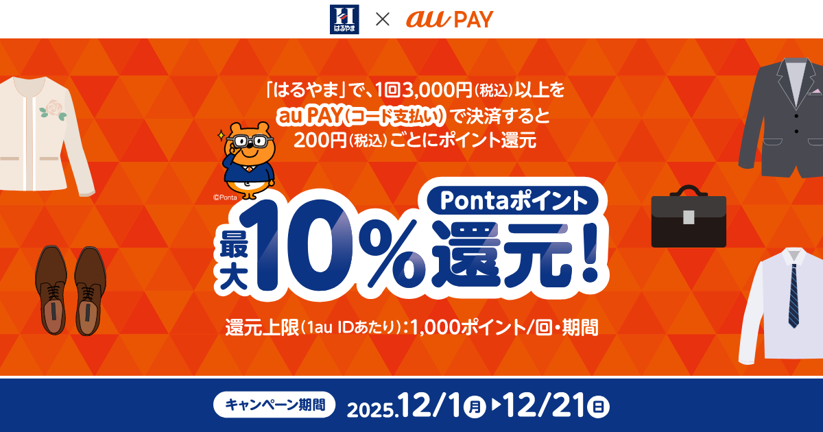 「はるやま」で、1回3,000円(税込)以上をau PAY(コード支払い)で決済すると200円(税込)ごとにPontaポイントを最大10%(20ポイント/200円)還元!