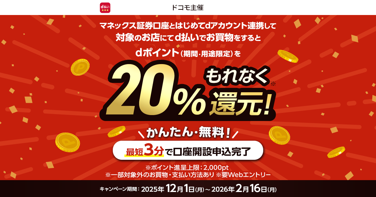 マネックス証券口座とはじめてのdアカウント連携+対象のお店にてd払いでお買物をすると、d払い20%還元キャンペーン!