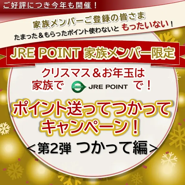 《JRE POINT家族メンバー限定》ポイント送ってつかってキャンペーン!<第2弾 つかって編>についての詳細情報をご案内します。JRE POINTはJR東日本のポイントサービスです。貯めたポイントは、Suicaへのチャージや駅ビルでのお買...
