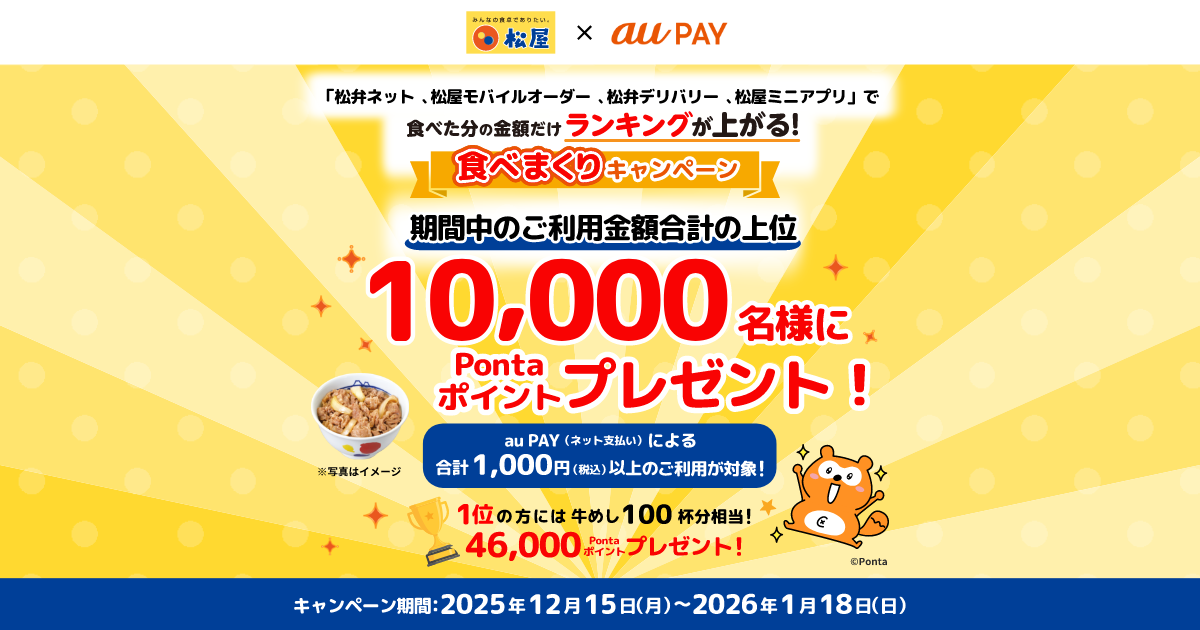 松弁ネット/松屋モバイルオーダー/松弁デリバリー/松屋ミニアプリでのau PAY(ネット支払い)による1回1,000円以上の決済の合計額上位10,000名に下記のPontaポイントを付与