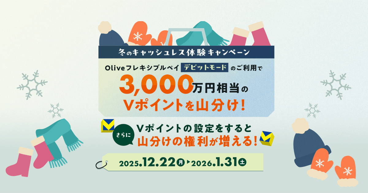 Oliveフレキシブルペイ デビットモードのご利用で3,000万円相当のVポイントを山分け!さらに、Vポイントの設定をすると山分けの権利が増える!