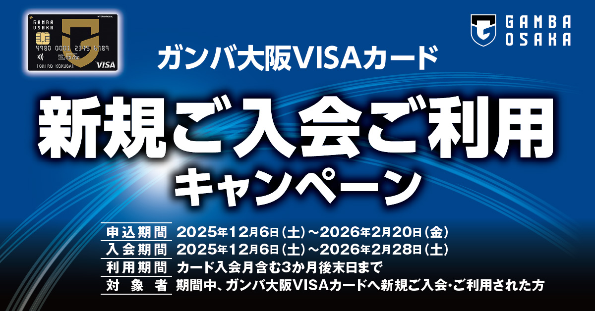期間中にガンバ大阪VISAカードに新規に申し込み、2026年2月28日までにカード発行、入会翌々月までに条件を満たすと下記の特典を付与