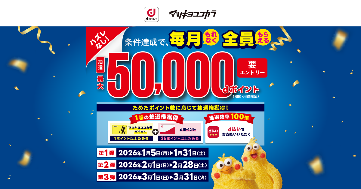 株式会社NTTドコモのプレスリリース(2026年1月5日 10時00分)マツモトキヨシ・ココカラファインにおいて「はずれなし!毎月最大5万ポイント当たるキャンペーン」を開催