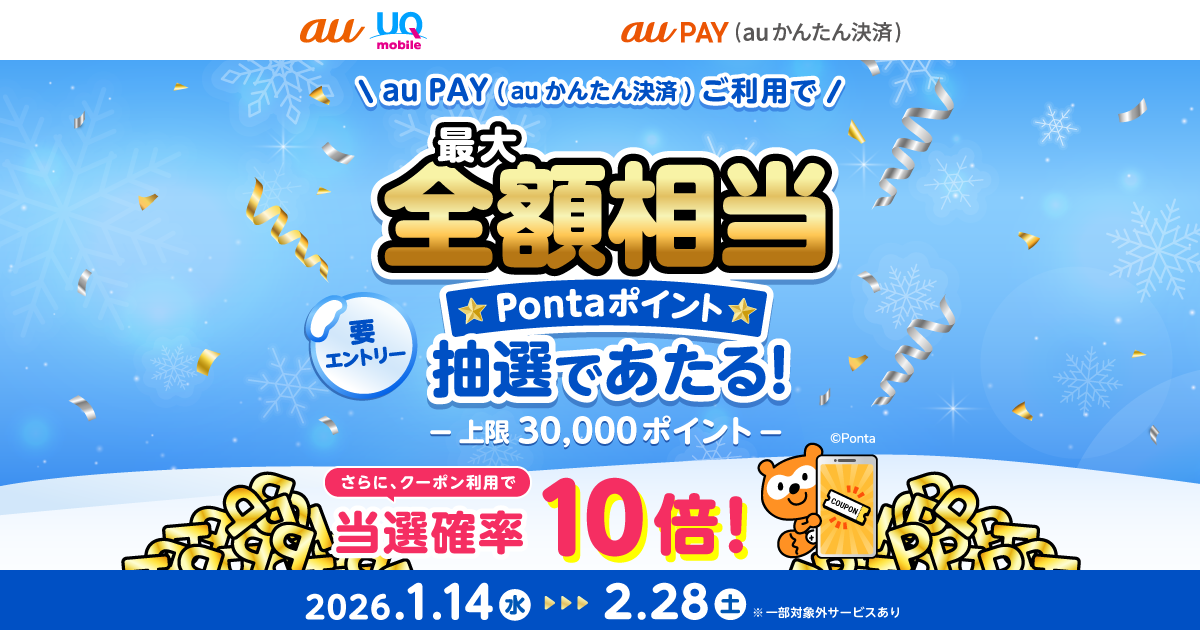 au PAY(auかんたん決済)ご利用で最大全額相当Pontaポイントあたる!クーポン利用で当選確率10倍!
