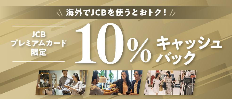アメリカ本土、オーストラリア、イギリス、フランスの対象店舗にて、対象のJCBプレミアムカードを合計25,000円以上(日本円換算時)利用すると10%をキャッシュバック