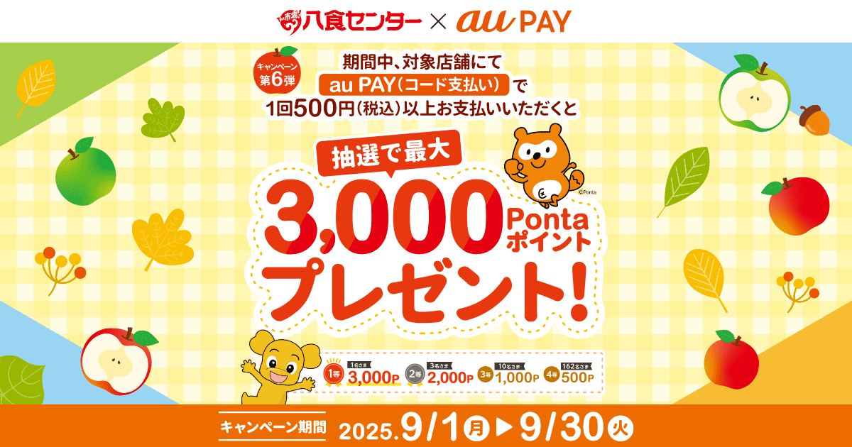 「八食センター内の対象店舗」で1回500円(税込)以上をau PAY(コード支払い)で決済すると、抽選で最大3,000Pontaポイントプレゼント!
