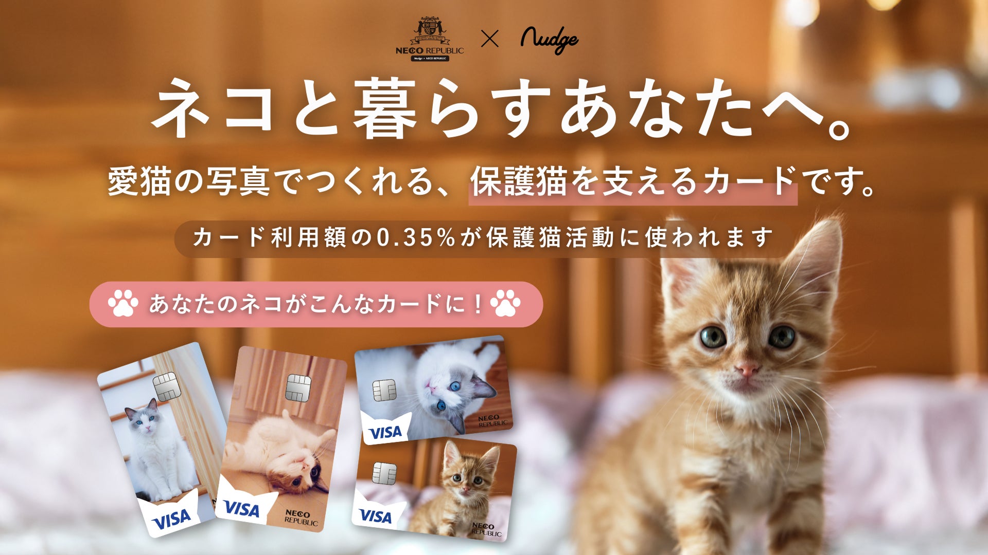ナッジ株式会社のプレスリリース(2025年9月1日 13時30分)決済額の0.35%が保護猫活動の応援に。愛猫写真でつくる世界で1枚のクレジットカードが登場