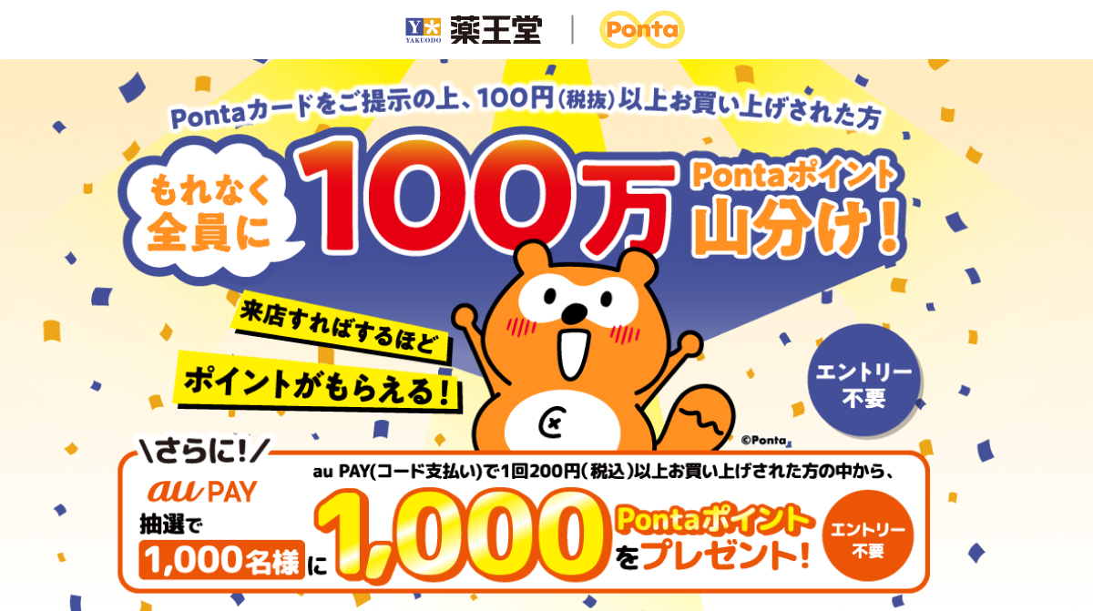 薬王堂でPontaカードを提示して100円(税抜)以上お買い物すると、もれなく全員で100万Pontaポイント山分け!さらにau PAY(コード支払い)で200円(税込)以上お買い物すると、抽選で1,000名様に1,000Pontaポイント...