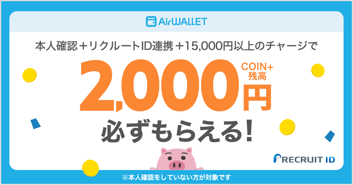 本人確認+リクルートID連携+15,000円以上チャージで全員に2,000円COIN+残高プレゼント!