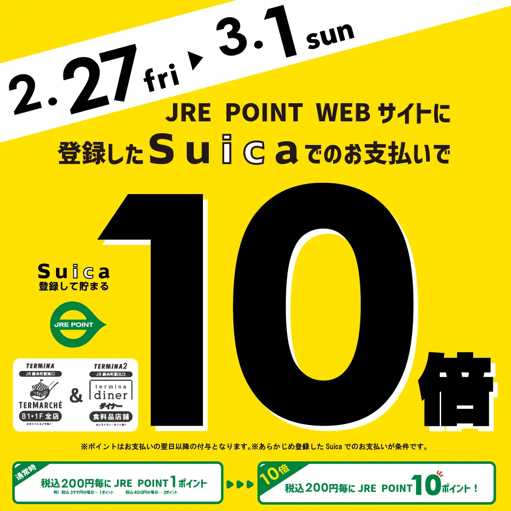【錦糸町テルミナ 店舗限定】登録したSuicaで貯まるJRE POINT10倍デー | キャンペーン | JR東日本のポイントサービス - JRE POINT