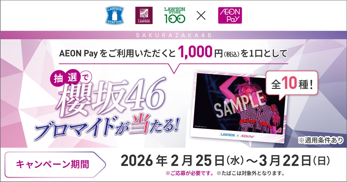 ローソン・ナチュラルローソン・ローソンストア100でのAEON Payのコード決済利用合計額1,000円を1口として、抽選で4,600名に櫻坂46メンバーのブロマイド(L判)が全10種からランダムで1枚当たる