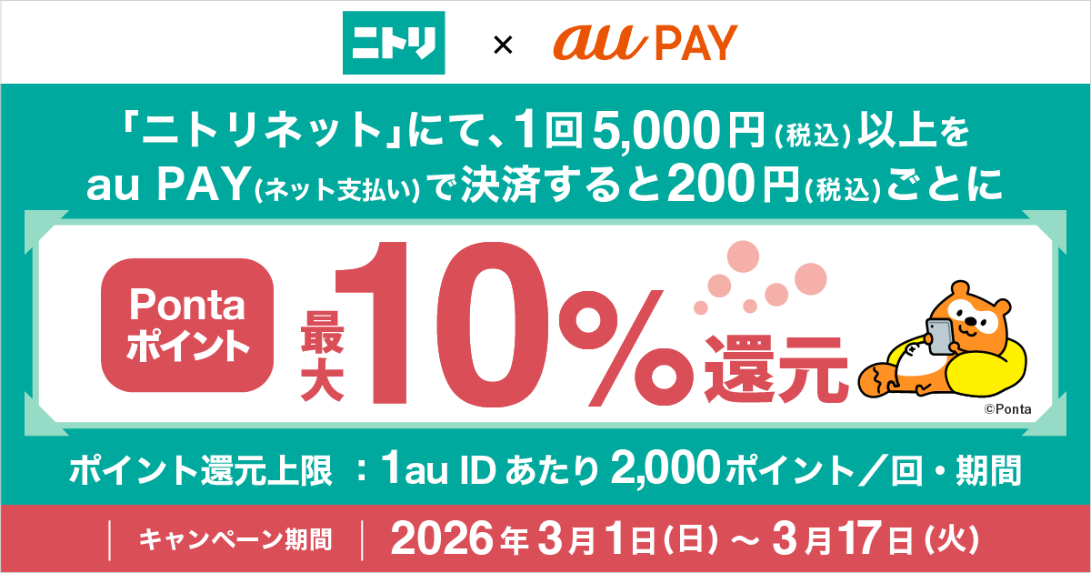 ニトリネットにてau PAY(ネット支払い)で決済された方を対象に、Pontaポイント最大10%還元!キャンペーン期間:2026年3月1日~3月17日