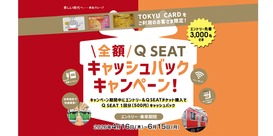 実施期間中にキャンペーンにエントリー(先着3,000名)し、対象のTOKYU CARDでQ SEATの座席指定券をご購入いただいたお客さまに、Q SEAT乗車1回分(500円)をキャッシュバックいた
