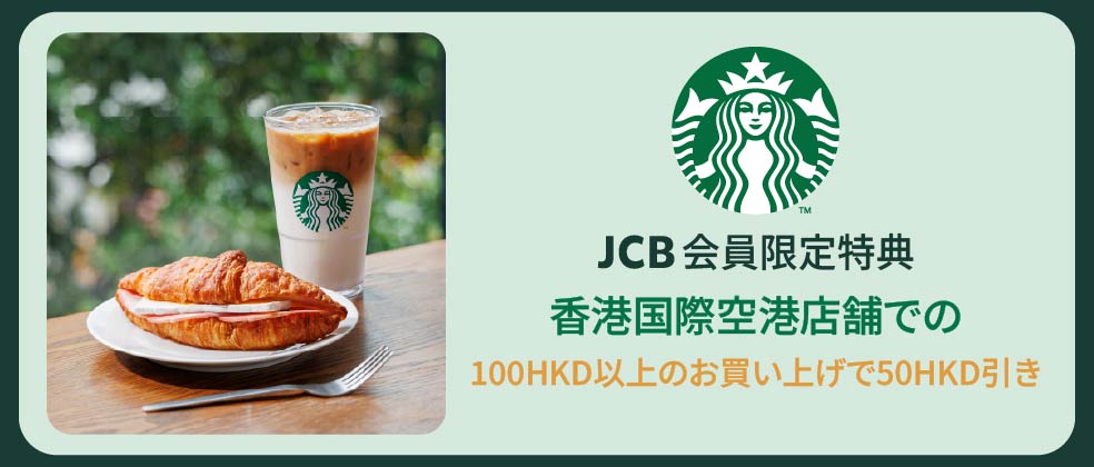 香港国際空港内のスターバックス(計6店舗)にて、トールサイズ以上のドリンクを含む合計100HKD(香港ドル)以上を注文し、搭乗券の提示およびキャンペーン利用の旨を伝えてJCBブランドのカードで支払うと50HKD引き