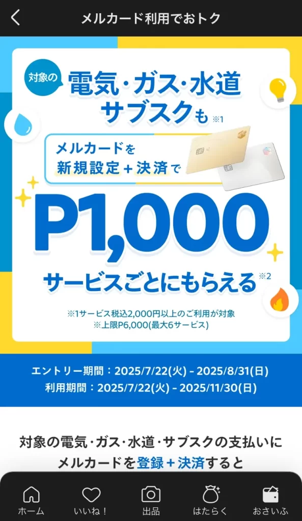 対象の電気・ガス・水道・サブスクの支払いにメルカードを初めて登録し、1サービス(加盟店)につき合計2,000円以上の決済をすると1,000Pのメルカリポイントを付与